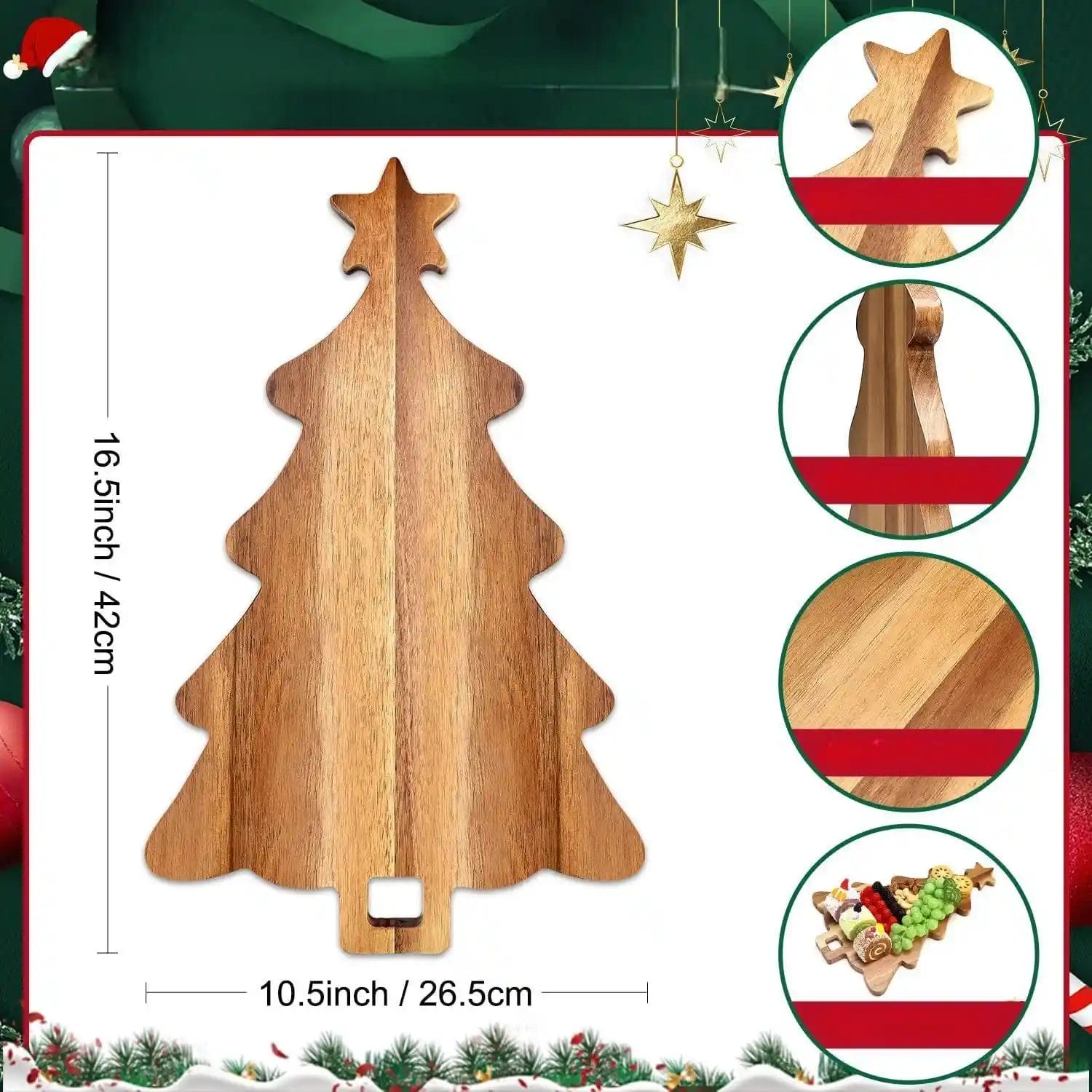 Vielseitige Nutzung: Das Holz Serviertablett eignet sich sowohl zum stilvollen Servieren von Snacks, Vorspeisen und Feinkost als auch als praktisches Schneidebrett. Es bringt festliche Stimmung in jede Küche und ist besonders in der Weihnachtszeit ein attraktives Küchenaccessoire.