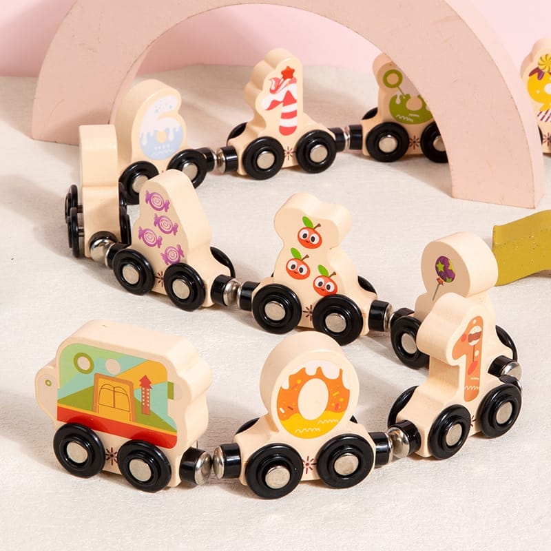 Hochwertige Materialien und sichere Verarbeitung: Gefertigt aus ausgewähltem Vollholz mit fein geschliffener Oberfläche, splitterfrei und schonend für Kinderhände. Die verbesserten Magnetverbindungen sorgen für feste Kupplungen zwischen den Wagen, gleichzeitig sind sie kindersicher und leicht zu lösen. Ein farbenfroher Aufbewahrungsbeutel fördert zudem Ordnungssinn und Transportfähigkeit.- Frühes Lernen mit Zahlen und Tieren: Das Set besteht aus 11 Wagen mit Zahlen und unterschiedlichen Tiermotiven, die spielerisch bei der Zahlen‑ und Tiererkennung helfen. Kinder lernen Ziffernreihenfolgen, zählen und ordnen auf eine motivierende, haptische Weise.